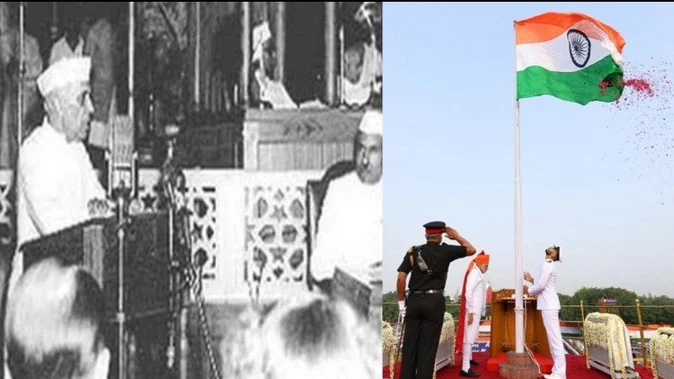 यो तस्बिरमा एकातिर नेहरू १४ अगस्टको साँझ संविधानसभालाई सम्बोधन गरिरहेका छन् । यो स्वतन्त्र भारत को पहिलो सम्बोधन थियो। दोस्रो तस्बिरमा भारतका वर्तमान प्रधानमन्त्री मोदी अगस्ट १५ मा दिल्लीको लाल किल्लाको प्राङ्गणबाट झण्डा फहराउँदै छन्।