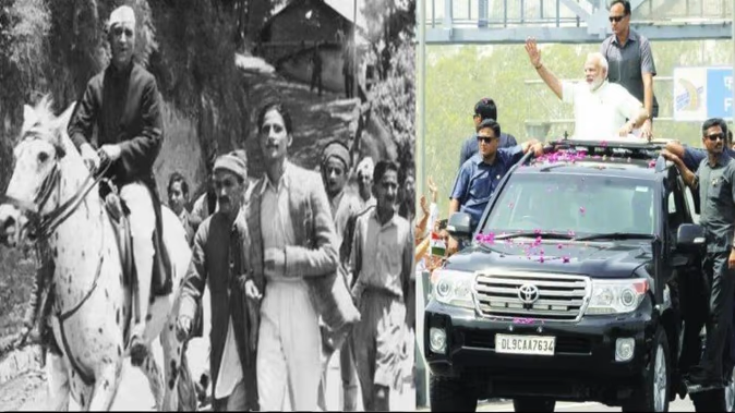 यो तस्बिरमा स्वतन्त्र भारतका प्रथम प्रधानमन्त्री नेहरू र वर्तमान प्रधानमन्त्री मोदी देखिएका छन् । पहिलो तस्बिरमा पण्डित नेहरू घोडामा चढिरहेका छन् । उनी भारतको स्वतन्त्रतापछिको कांग्रेस कार्यसमितिको बैठकमा सहभागी हुन जाँदै गर्दाकाे तस्बिर हाे याे । त्यतिबेला प्रधानमन्त्रीको सुरक्षा आजको जस्तो थिएन । दोस्रो तस्बिरमा मोदी, जसको सुरक्षाका लागि एसपीजी, बुलेट प्रुफ गाडीसमेत छ ।