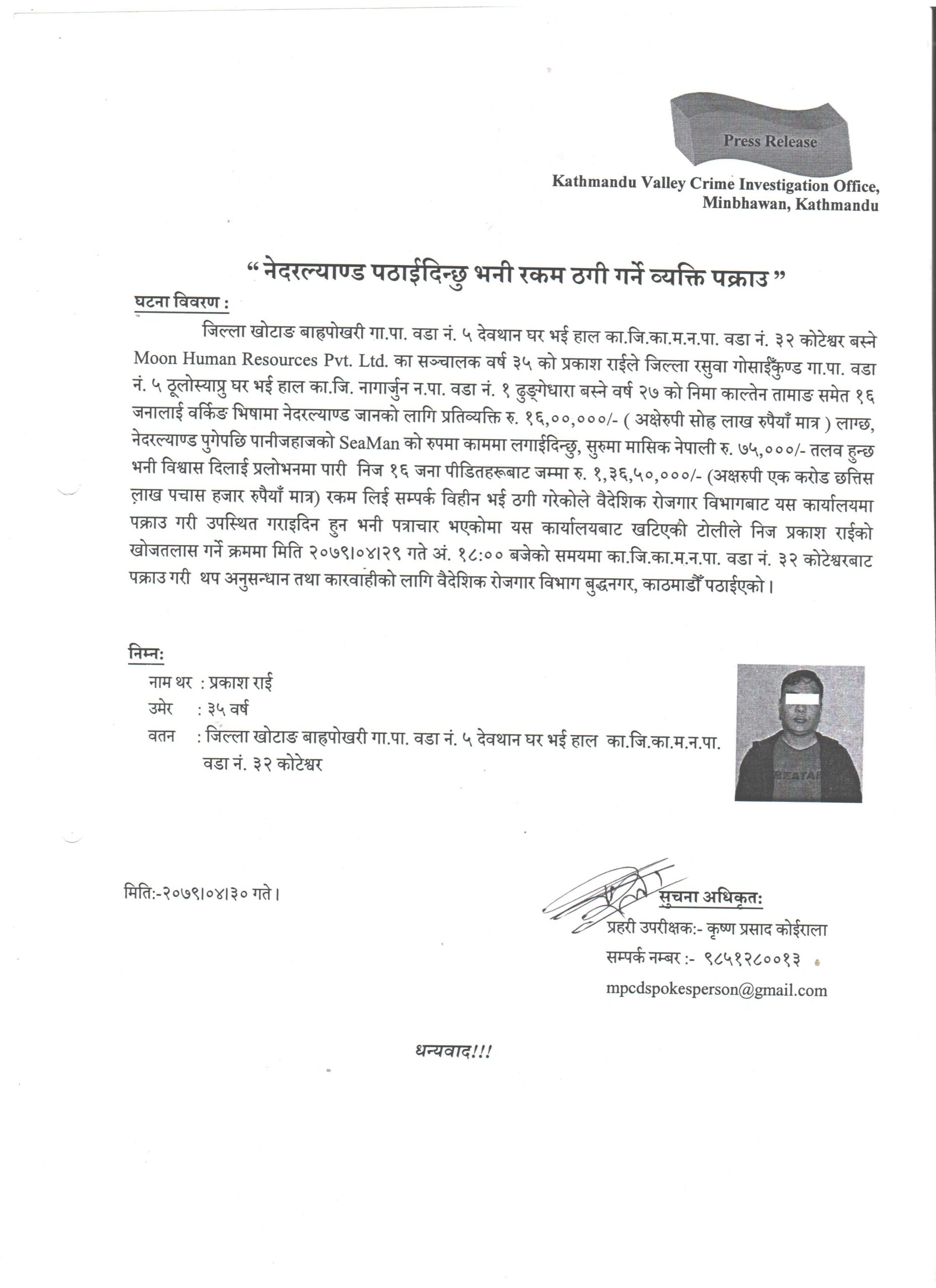काठमाडौं । वैदेशिक रोजगारिका लागि नेदरल्याण्ड पठाईदिने भन्दै ठगी गरेको आरोपमा प्रहरीले एक जनालाई पक्राउ गरेको छ । खोटाङको बाह्रपोखरी गाउँपालिका ५ देवस्थान घर भई हाल काठमाडौंको कोटेश्वरमा बसेर मुन ह्युमन रिर्सोस प्रा.लि.सञ्चालन गर्दै आएका ३५ बर्षीय प्रकाश राईलाई प्रहरीले पक्रेको हो ।