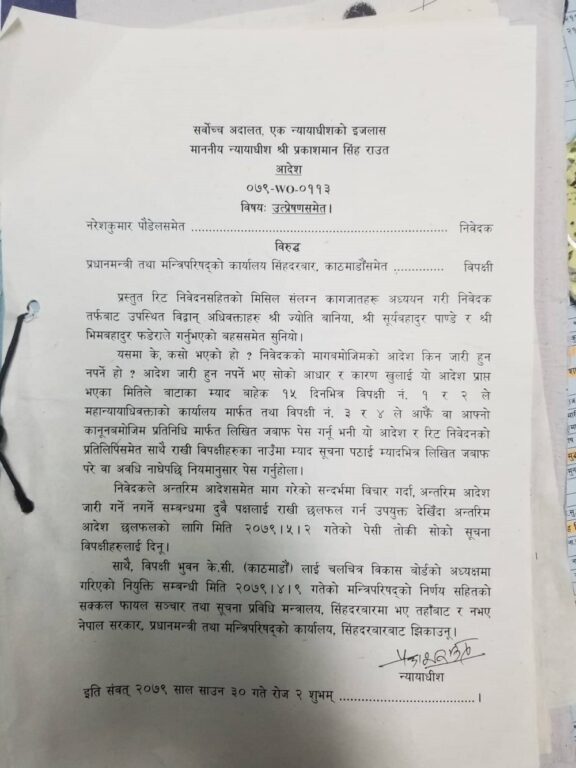 नरेशकुमार पौडेलसहितले केसीको नियुक्तिविरुद्ध दायर गरेको रिटमाथि सोमबार सुनुवाइ गर्दै न्यायाधीश प्रकाशमान सिंह राउतको एकल इजलासले सरकारको निर्णयको सक्कल फाइल मागेको हो ।