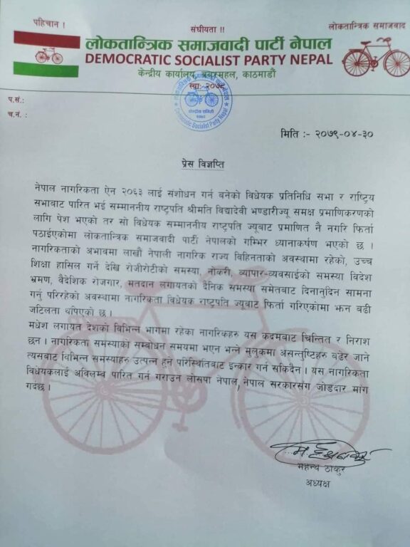 काठमाडौं । लोकतान्त्रिक समाजवादी पार्टी (लोसपा)ले नागरिकता विधेयकमा राष्ट्रपतिको कदमबाट मधेसमा चिन्तित र निराशा बढाएको प्रतिक्रिया दिएको छ । अध्यक्ष महन्थ ठाकुरले एक विज्ञप्ति जारी गर्दै नागरिकता समस्याको सम्बोधन समयमा नभए मुलुकमा असन्तुष्टि बढ्ने चेतावनी दिएका हुन् ।