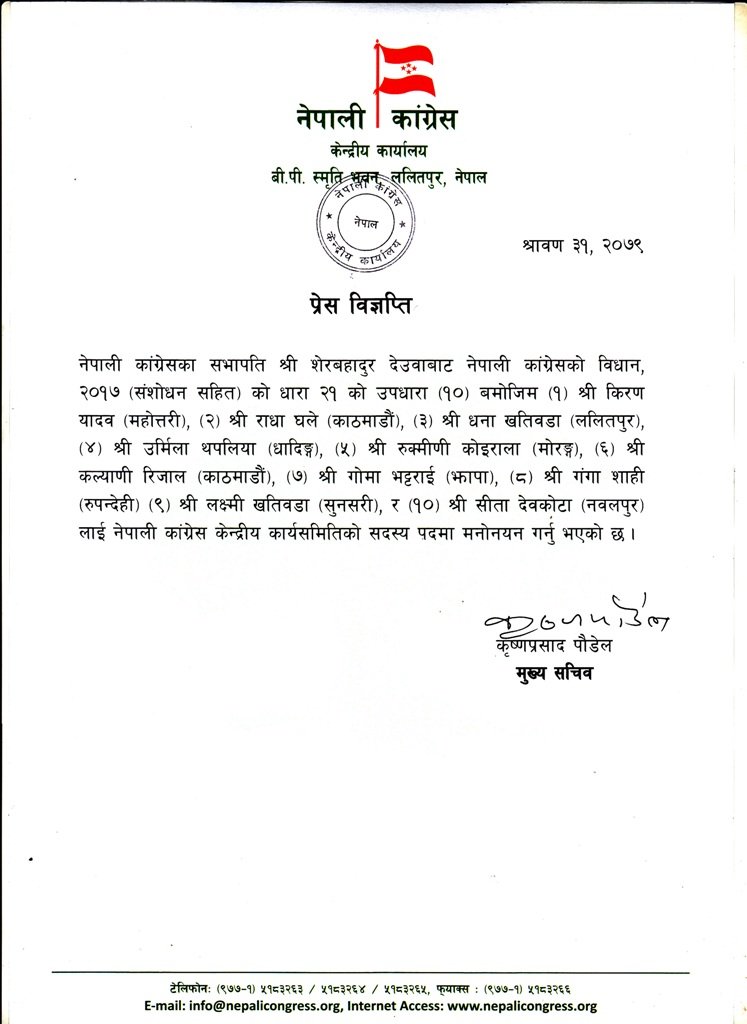 नेपाली कांग्रेसको विधान, २०१७ (संशोधनसहित) को धारा २१ को उपधारा (१०) बमोजिम केन्द्रीय सदस्यमा मनोनीत गरिएको मुख्य सचिव कृष्णप्रसाद पौडेलद्वारा जारी विज्ञप्तिमा भनिएको छ ।