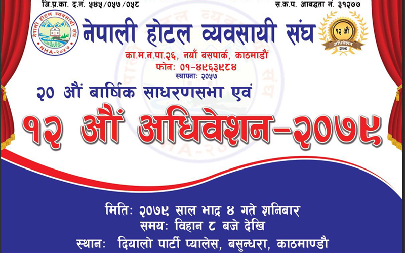 काठमाडौं । नेपाली होटल व्यवसायी संघको २० औं वार्षिक साधारणसभा तथा १२ औं अधिवेशन आगामी भदौ ४ गते हुने भएको छ ।