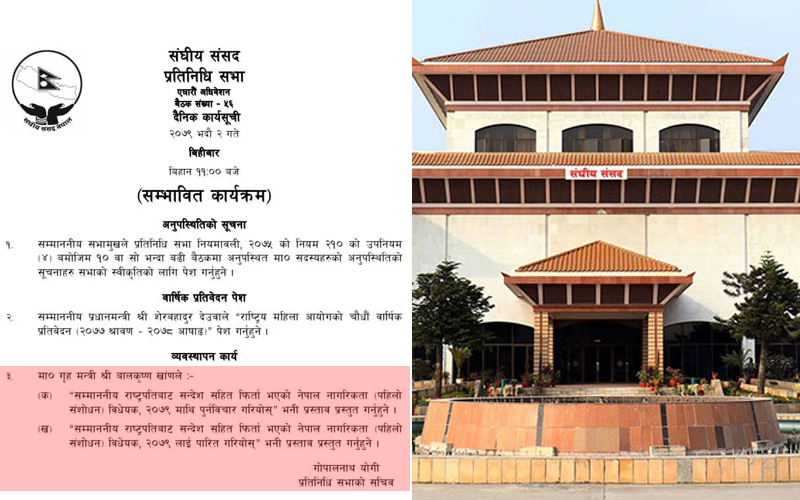 बिहीवार बस्ने प्रतिनिधिसभाको संभवित कार्यसूचीमा राष्ट्रपतिबाट फिर्ता आएको नागरिकता विधेयक पारित गर्ने कार्यसूची छ ।