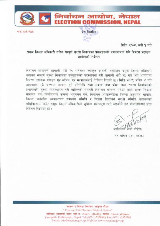 आयोगले आज (बुधबार) आगामी भदौ २० गतेसम्म स्वीकृत दरबन्दी बमोजिम सिडीओलगायत सम्पूर्ण सुरक्षा निकायका प्रमुखहरूको पदस्थापना गरीे भदौ २५ गते भित्र आयोगमा विवरण उपलब्ध गराउन गृह–सचिव तथा गृह मन्त्रालयलाई निर्देशन दिएको हो ।