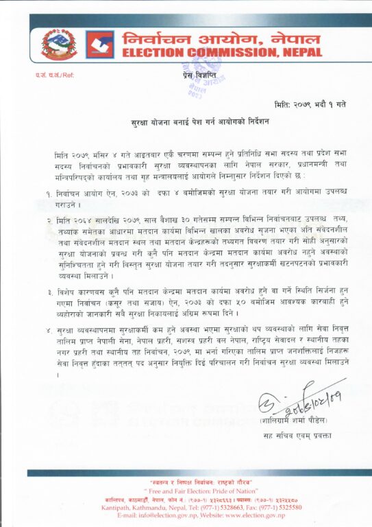 आयोगले निर्वाचन आयोग ऐन, २०७३ को दफा ४ बमोजिमको सुरक्षा योजना तयार गरी आयोगमा उपलब्ध गराउन, २०६४ सालदेखि २०७९ साल वैशाख ३० गतेसम्म सम्पन्न विभिन्न निर्वाचनबाट उपलब्ध तथ्य, तथ्यांकसमेतका आधारमा मतदान कार्यमा विभिन्न खालका अवरोध सृजना भएका अति संवेदनशील तथा संवेदनशील मतदान स्थल तथा मतदान केन्द्रहरूको तथ्यगत विवरण तयार गरी सोही अनुसारको सुरक्षा योजनाको प्रबन्ध गर्न र कुनै पनि मतदान केन्द्रमा मतदान कार्यमा अवरोध नहुने अवस्थाको सुनिश्चितता हुने गरी विस्तृत सुरक्षा योजना तयार गरी सोहीअनुसार सुरक्षाकर्मी खटनपटनको प्रभावकारी व्यवस्था मिलाउ भनिएको छ ।