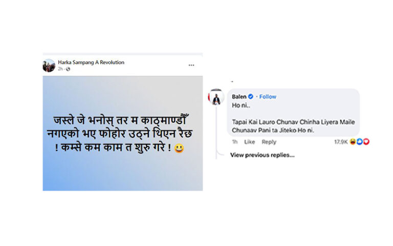 ‘हो नि.. ‘तपाईंकै लौरो चुनाव चिह्न लिएर मैले चुनाव पनि त जितेको हो नि !’ यो चाहीँ साम्पाङको स्टाटसमा काठमाडौंका मेयर बालेन शाहले गरेको कमेण्ट (प्रतिक्रिया) हो ।