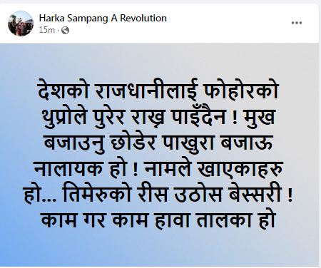 साम्पाङको उक्त स्टाटसमा बालेनले कमेण्ट गरेपछि साम्पाङले पुनः अर्को स्टाटस पनि राखेका छन् । जसमा उनले भनेका छन्,‘ देशको राजधानीलाई फोहोरको थुप्रोले पुरेर राख्न पाइँदैन ! मुख बजाउनु छोडेर पाखुरा बजाऊ नालायक हो ! नामले खाएकाहरु हो… तिमेरुको रीस उठोस बेस्सरी ! काम गर काम हावा तालका हो ।’