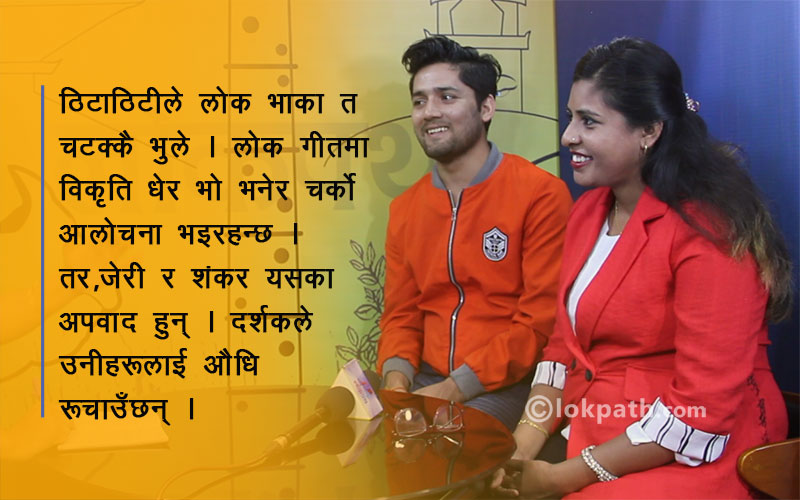 यस्तै घम्साघम्सी गर्दै दर्शकलाई लालायित बनाउँछन् बबिता बाँनिया उर्फ ‘जेरी’ र शंकर क्षेत्री । अहिलेका उदीयमान लोक गायक-गायिका । अहिलेका ठिटाठिटीले लोक भाकालाई चटक्कै बिर्सिए, लोक गीतमा विकृति भित्रिएको छ भनेर चर्को आलोचना भइरहन्छ । तर,जेरी र शंकर यसका अपवाद हुन् ।