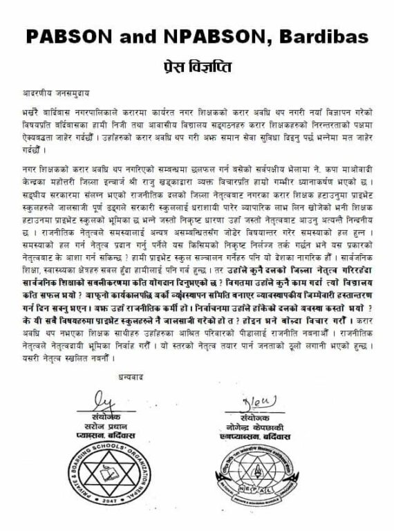 ‘करारका शिक्षक हटाउन व्यापारिक लाभ लिने उदेश्यले निजी विद्यालय समेत लागि परेको भन्ने अभिव्यक्तिप्रति हाम्रो ध्यानकर्षण भएको छ ।’ एनप्याबसन बर्दिबासका संयोजक सरोज प्रधानले भनेका छन् ।