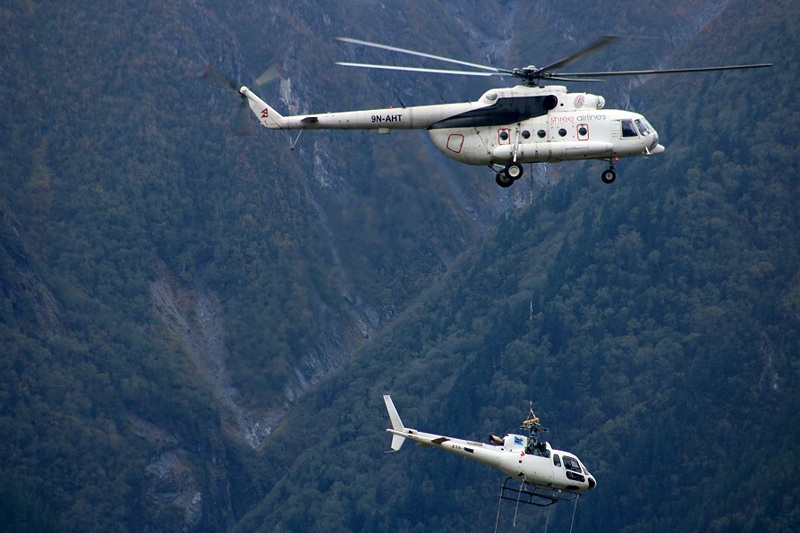 मनाङको ‘९ एन–एएमभी’ कलसाइन भएको ६ सिटे ‘एएस ३५० बिथ्री–ई’ सिरिजको हेलिकोप्टरलाई मंगलवार श्री एयरको ठूलो हेलिकप्टरले हिल्साबाट झुण्ड्याएर ल्याएको हो ।
