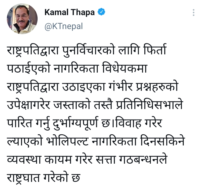 थापाले गरेको द्विटमा थप्दै ‘विवाह गरेर ल्याएको भोलिपल्ट नागरिकता दिनसकिने व्यवस्था कायम गरेर सत्ता गठबन्धनले राष्ट्रघात गरेको आरोपसमेत लगाएका छन् ।’