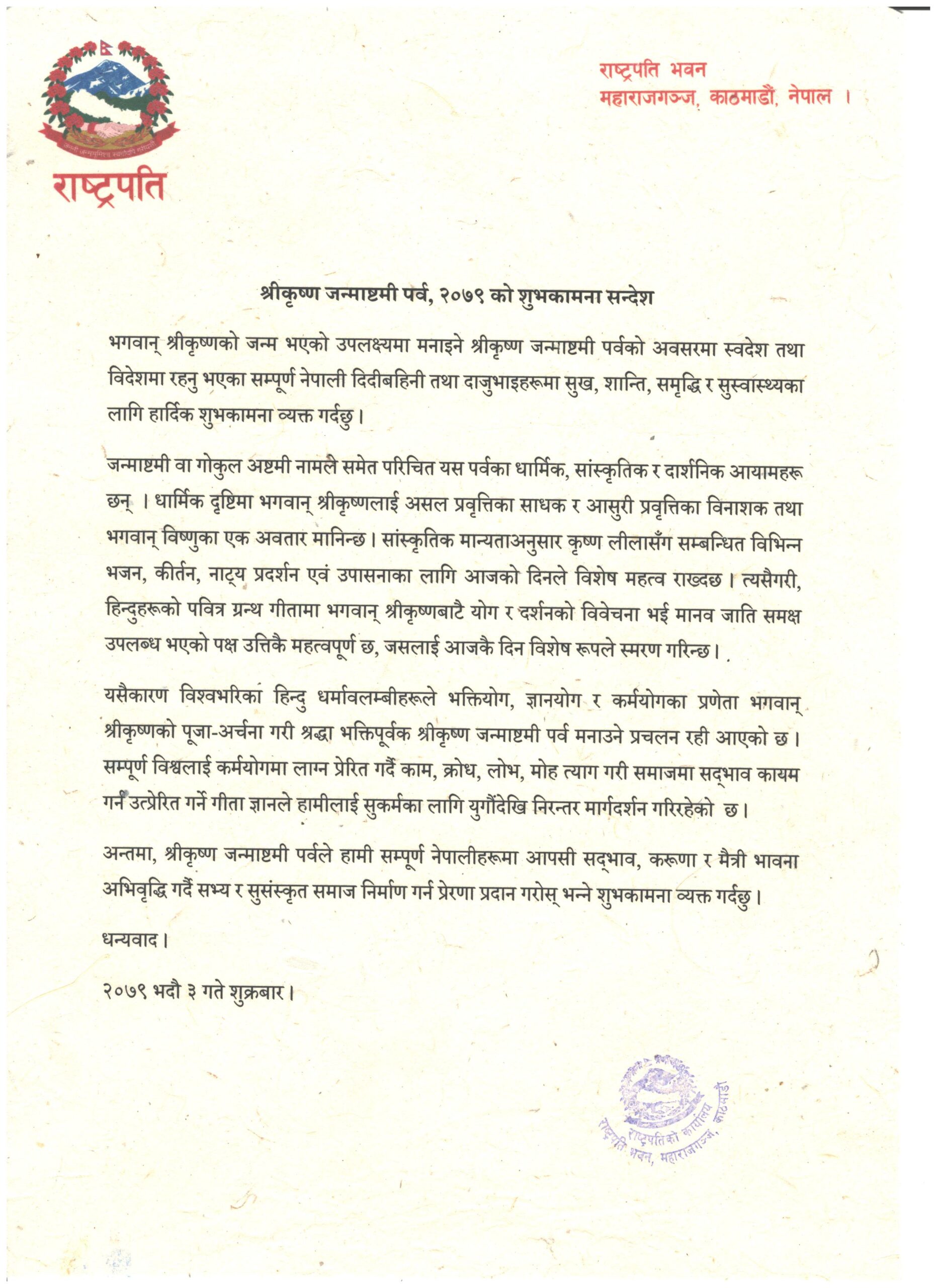 पत्रमा भण्डारीले श्रीकृष्ण जन्माष्टमी पर्वले हामी सम्पूर्ण नेपालीहरूमा आपसी सद्भाव, करूणा र मैत्री भावना अभिवृद्धि गर्दै सभ्य र सुसंस्कृत समाज निर्माण गर्न प्रेरणा प्रदान गरोस् भन्ने शुभकामना व्यक्त गरेकी छन् ।