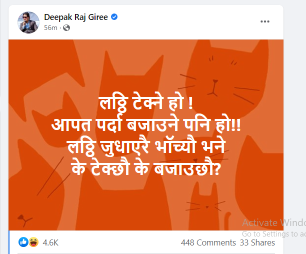 कलाकार गिरीले फेसबुकमा लेखेका छन्, ‘ लठ्ठी टेक्ने हो, आपत पर्दा बजाउने पनि हो, लठ्ठी जुधाएरै भाँच्यौ भने के टेक्छौ के बजाउँछौ ?’