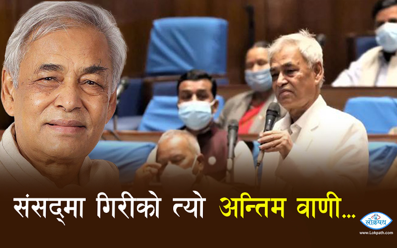 हो, अब त्यो खरो आवाज सदाका लागि त्यो बिदा भएको छ । उनै गिरीले प्रतिनिधि सभामा २०७८ साल साउन १९ गते अन्तिम सम्बोधन गरे । सम्बोधनमा भर्खरै प्रधानमन्त्री बनेका शेरबहादुर देउवालाई बधाई दिँदै विभिन्न कालखण्डको बयान गरे । साथै, प्रधानमन्त्रीलाई कोभिड नियन्त्रणमा लाग्न सुझाव दिँदै सम्बोधनलाई बिट मारेका थिए ।
