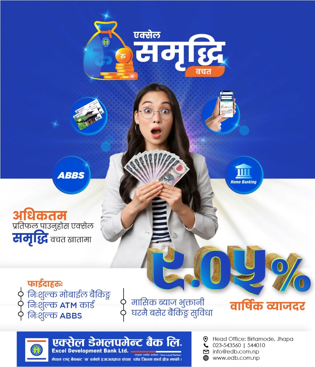 काठमाडौं । एक्सेल डेभलपमेन्ट बैंक लिमिटेडले सर्वसाधारणहरुको हितलाई मध्यनजर गर्दै “एक्सेल समृद्धि बचत खाता” सञ्चालनमा ल्याएको छ । यस बचत खातामा बार्षिक नौ दशमलव शुन्य पाँच प्रतिशत ब्याजदर प्राप्त गर्न सकिने बैंकले जनाएकोे छ । यस अन्र्तगत न्यूनतम दुई हजार रुपैयाँमा खाता खोल्न सकिने छ भने ब्याज मासिक रुपमा प्राप्त हुनेछ । “एक्सेल समृद्धि बचत खाता” सबै उमेर समुहका नेपाली नागरिकहरुले खोल्न सक्नेछन् ।