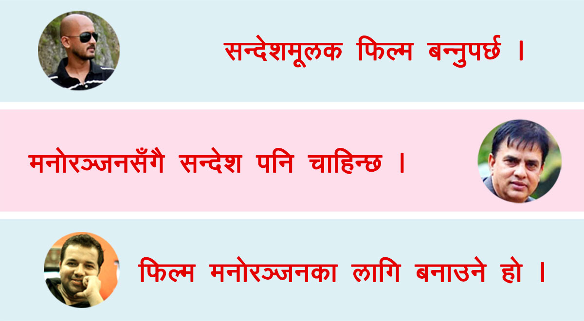 यो बहसमा दुई धार छुट्टिन्छन् । फिल्म मनोरञ्जनको प्याकेज हो भन्ने एकथरी हुन्छन् भने अर्काथरीले सन्देश पनि दिनुपर्छ भनिरहेका हुन्छन् । फिल्मले जे कथा बोकेको होस्, तर फिल्म ‘फिल्म’ को मर्मअनुसार चाहिँ बन्नुपर्छ ।
