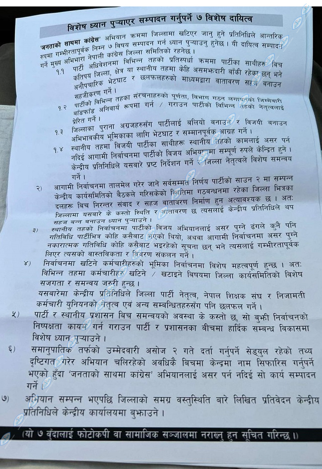 ‘पार्टी अधिवेशनमा विभिन्न तहको प्रतिष्पर्धा क्रममा पार्टीका साथीहरुबीच कतिपय जिल्ला, क्षेत्र या स्थानीय तहमा केहि असमझादारी बाँकी छन् भने अनौपचारिक भेटघाट र छलफलको माध्यमद्वारा वातावरण सहज बनाउन सहजीकरण गर्ने,’ कांग्रेसद्वारा जारी सात बुँदे विशेष दायित्वमा उल्लेख गरिएकाे छ ।