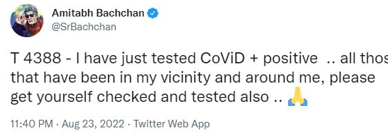 सामाजिक सञ्जालमार्फत बच्चनले कोभिड संक्रमित भएको जानकारी दिएका हुन । उनले आफुसँग संगतमा रहेका सबैलाई कोरोना टेस्ट गर्न अनुरोधसमेत गरेका छन ।