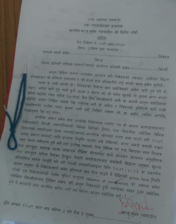 नगरपालिकाले पदपूर्तिका लागि निकालेको विज्ञापनमा शिक्षकहरूका लागी सुविधा सन्तुलनसमेत नदेखिएको अदालतको उत्प्रेषयुक्त परमादेशमा उल्लेख छ ।