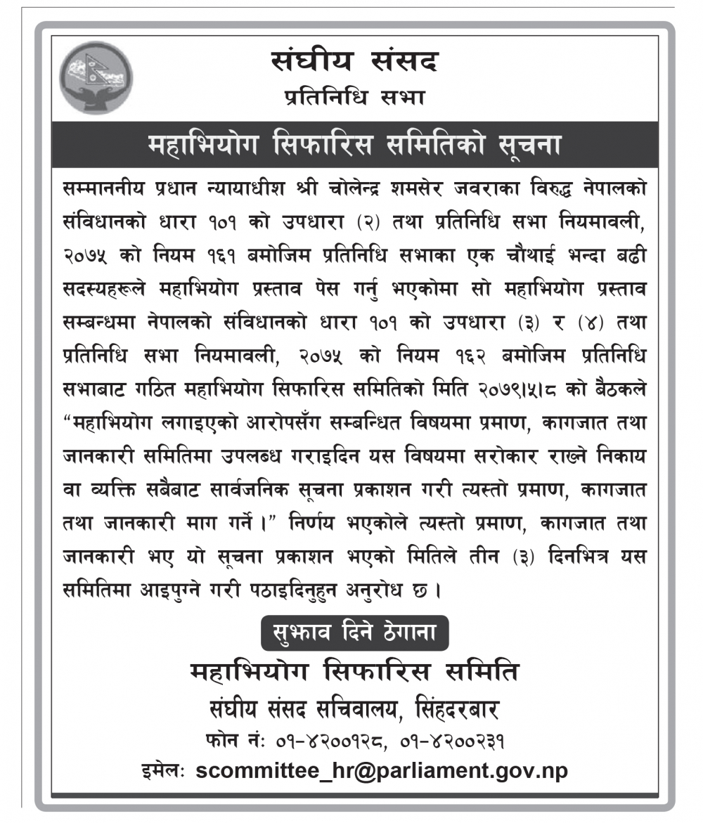 समितिको सूचनामा भनिएको छ, ‘महाभियोग लगाइएको आरोपसँग सम्बन्धित विषयमा प्रमाण, कागजात तथा जानकारी समितिमा उपलब्ध गराइदिन यस विषयमा सरोकार राख्ने निकाय वा व्यक्ति सबैबाट सार्वजनिक सूचना प्रकाश गरी त्यस्तो प्रमाण, कागजात तथा जानकारी माग गर्ने निर्णय भएकाले त्यस्तो प्रमाण कागजात तथा जानकारी भए यो सूचना प्रकाशन भएको मितिले ३ दिनभित्र यस समितिमा आइपुग्ने गरी पठाइदिनुहुन अनुरोध छ ।’