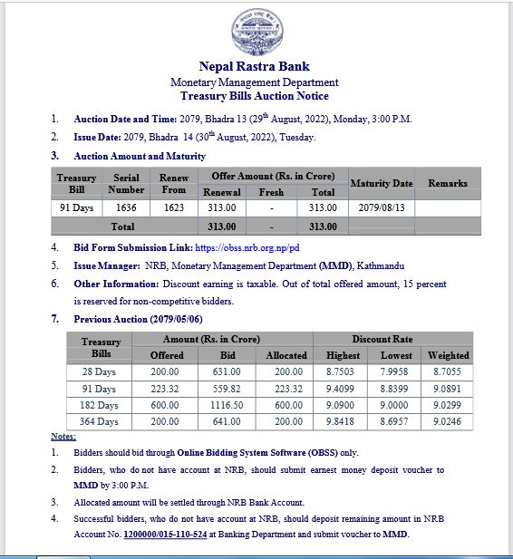 भदौ १४ गते जारी मिति तोकिएको ट्रेजरी खरिदको लागि वाणिज्य बैंक, विकास बैंक र फाइनान्स कम्पनीहरुले भाग लिन सक्नेछन् । बिक्री गरिने उक्त ट्रेजरी ९१ दिने अवधिको रहेको छ । यो ट्रेजरीहरुको परिपक्व हुने अवधि भने २०७९ मंसिर १३ गते तोकिएको छ । राष्ट्र बैंकका अनुसार यो ट्रेजरी पुरानो नवीकरण अन्तर्गत रहेको छ ।