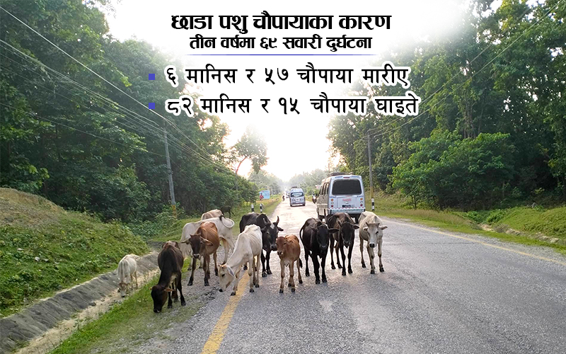 धनगढी । कैलाली कञ्चनपुरमा छाडा पशु चौपायाका कारण तीन वर्षमा ६९ सवारी दुर्घटना हुँदा ६ मानिस र ५७ चौपाया मरेका छन् । तीन बर्षमा छाडा चौपायाका कारण भएको दुर्घटनामा ८२ मानिस र १५ चौपाया घाइते भएका छन् ।