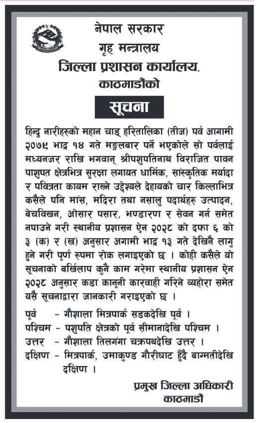 तीजका लागि सोमबारदेखि चारकिल्ला तोकेरै मदिरालगायत बिक्री वितरणमा रोक लगाइएको हो । काठमाडौंका प्रमुख जिल्ला अधिकारी गोविन्दप्रसाद रिजालले सार्वजनिक सूचना जारी गर्दै धार्मिक, साँस्कृतिक मर्यादा र पवित्रता कायम राख्न यस्तो नियम लगाइएको उल्लेख गरेका छन् ।