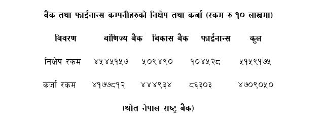 यस अवधिमा सञ्चालनमा रहेका २६ वटा वाणिज्य बैंकहरुले मात्र भने कुल ४५ खर्ब ४५ हजार १५ करोड ७० लाख रुपैयाँ निक्षेप संकलन गरी ४१ खर्ब ७७ अर्ब ८१ करोड २० लाख रुपैयाँ कर्जा प्रवाह गरेको छ । सञ्चालनमा रहेका १७ वटा विकास बैंकहरुले भने यसअवधिमा पाँच खर्ब नौ अर्ब ९० करोड रुपैयाँ निक्षेप संकलन गरी चार खर्ब ४४ अर्ब ९३ करोड ४० लाख रुपैयाँ कर्जा प्रवाह गरेका छन् ।
