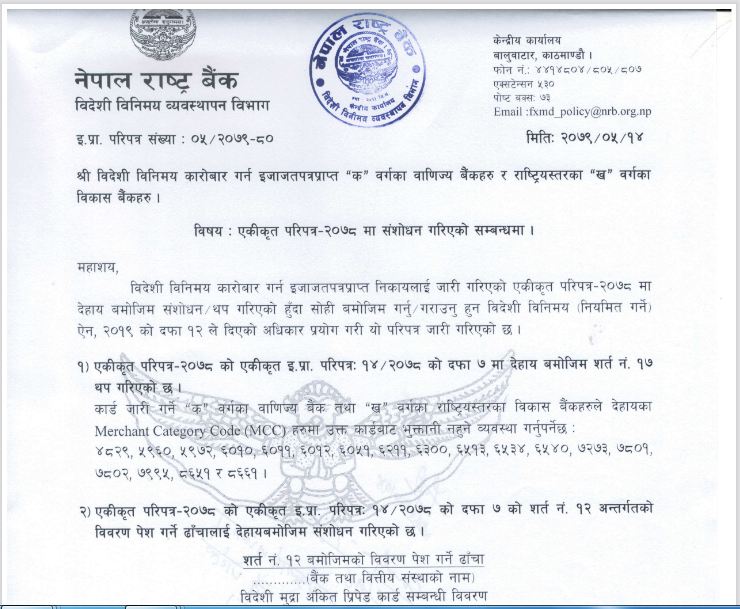 राष्ट्र बैंकले मंगलवार जारी गरेको डलर कार्डको प्रयोग सम्वन्धी संसोधित व्यवस्था अनुसार अब देखि १८ प्रकारका वस्तु तथा सेवाको खरिदमा डलर कार्डको प्रयोग पुर्णरुपमा बन्देज भएको छ । जसअन्तर्गत ४८२९, ५९६०, ५९७२, ६०१०, ६०११, ६०१२, ६०५१, ६२११, ६३००, ६५१३, ६५३४, ६५४०, ७२७३, ७८०१, ७८०२, ७९९५, ८६५१ र ८६६१ सहितका १८ वटा मर्चेन्ट क्याटागोरी कोड (एमसीसी) अन्तर्गतका वस्तु तथा सेवाहरुमा डलर कार्डबाट भुक्तानी गर्न प्रतिबन्ध लगाईएको छ ।