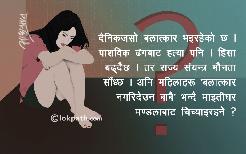 लैङ्गिक पाटोबाट पाउने अधिकारलाई एकछिन थाँति राखेर कुरा गर्ने हो भने पनि एउटा नागरिकको हैसियतमा महिलाले पाउने अधिकार किन पाएका छैनन् ? दैनिकजसो कोही न कोही, काहीँ न काहीँ बलात्कृत भइरहेका छन् । पाशविक ढंगबाट हत्या पनि । हिंसा बढ्दैछ । तर राज्य संयन्त्र मौनता साँध्छ । अनि महिलाहरु ‘बलात्कार नगरिदेउन बाबै’ भन्दै माइतीघर मण्डलाबाट चिच्चाइरहने ?