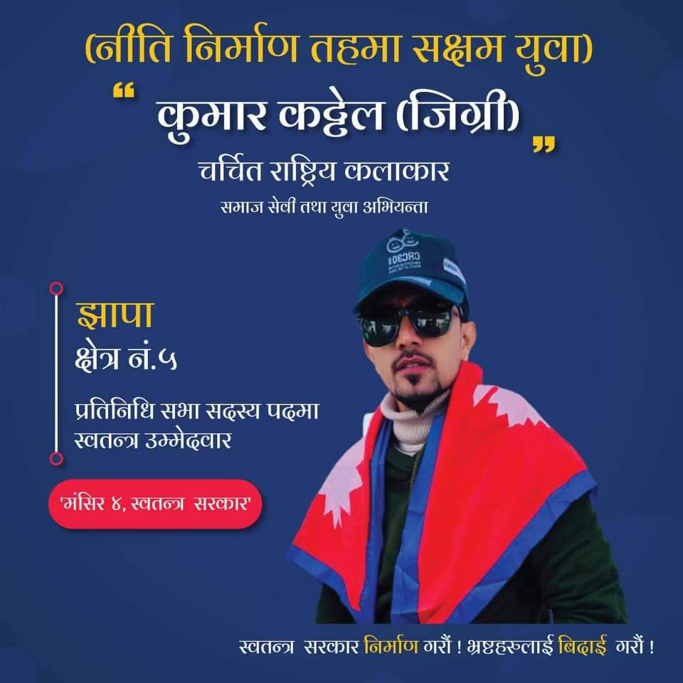 जिग्री उपनामले चर्चित कुमारले ‘नीति निर्माण तहमा सक्षम युवा’ भन्ने नारासहित झापा क्षेत्र नं ५ बाट उम्मेदवारी दिएका हुन् ।