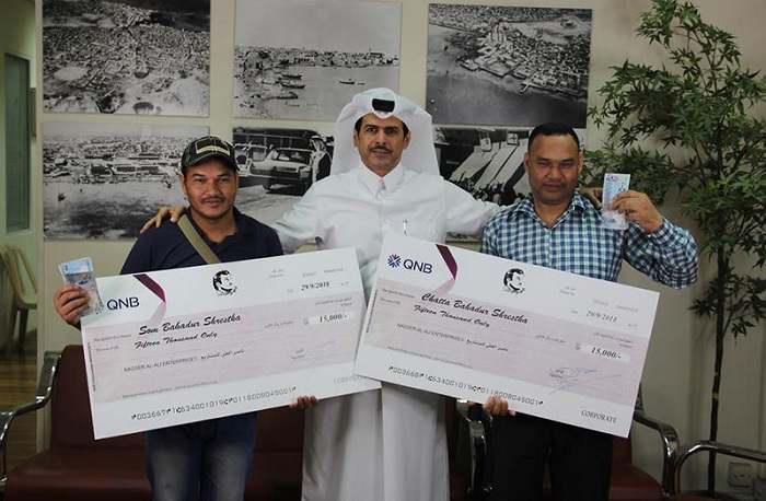 काठमाडौं । आइओएस प्राप्त कतारको एक प्रतिष्ठित कम्पनीमा विगत १० वर्षदेखि कार्यरत सिन्धुपाल्चोकका सहोदर दाजुभाई छटट बहादुर श्रेष्ठ र सोम बहादुर श्रेष्ठले जनही १५ हजार रियाल पुरस्कार पाएका छन् । इमान्दारी पुर्वक कम्पनीमा काम गरेवापत् नासर अल अलि इन्टरप्राइसेस कम्पनीका मालिक नासर अल अलीको हातबाट सो पुरस्कार प्राप्त गरेका हुन् ।
