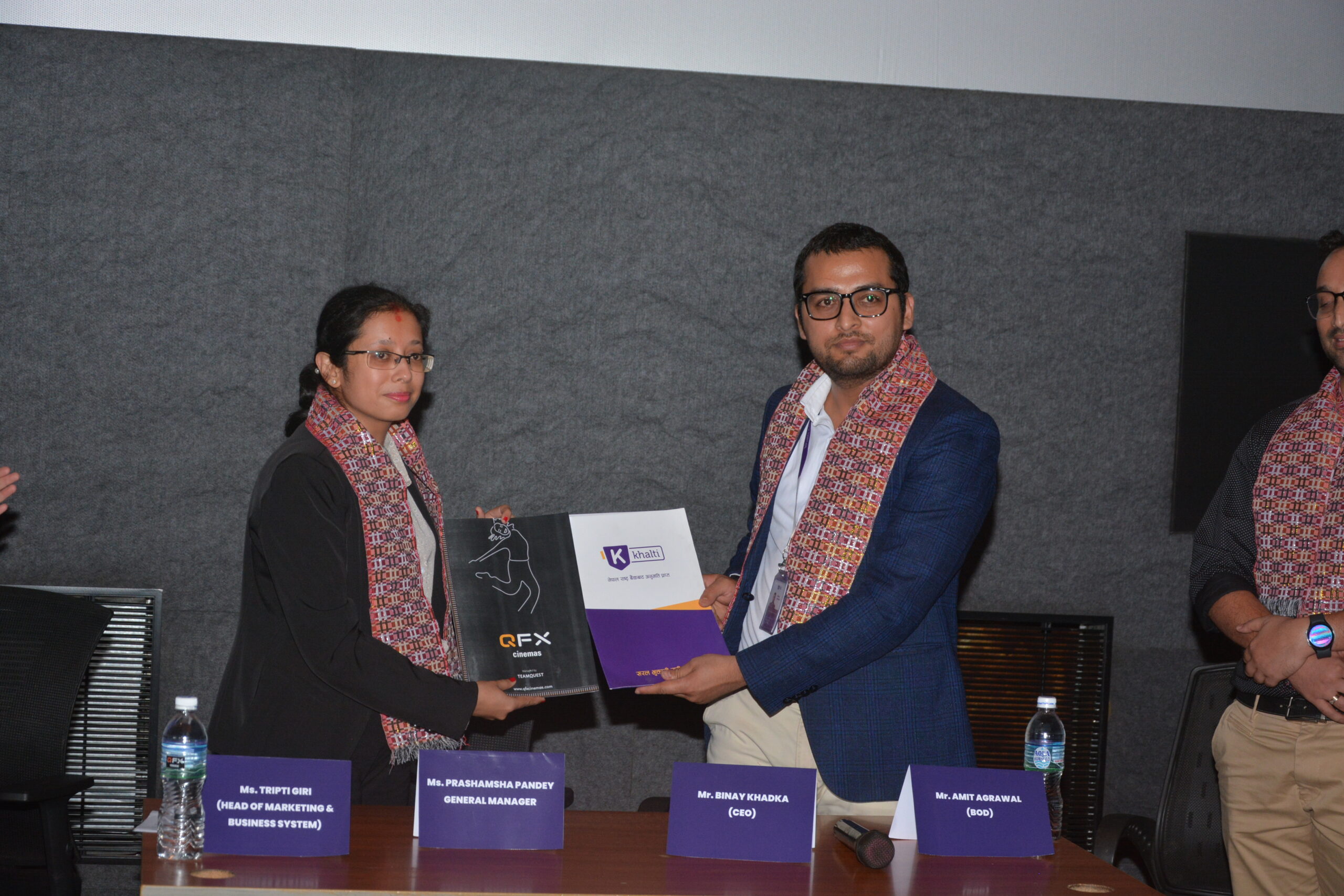 यसैगरी यस सेवाको बारेमा बोल्दै क्यूएफएक्सका महाप्रबन्धक प्रशंसा पाण्डेले भनिन् “क्यूएफएक्सले सधैँ ग्राहकहरुको सिनेमा हेर्ने अनुभवलाई प्राथमिकता दिँदै आएको छ, हामी आशा गर्छौँ कि खल्तीसँगको यस सहकार्यले हाम्रा सिनेमा प्रेमी ग्राहकहरुलाई थप सुविधा दिनेछ ।”