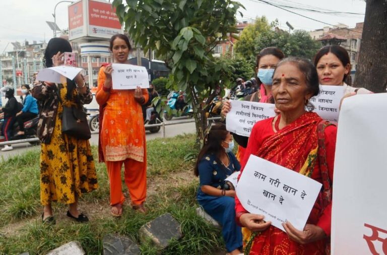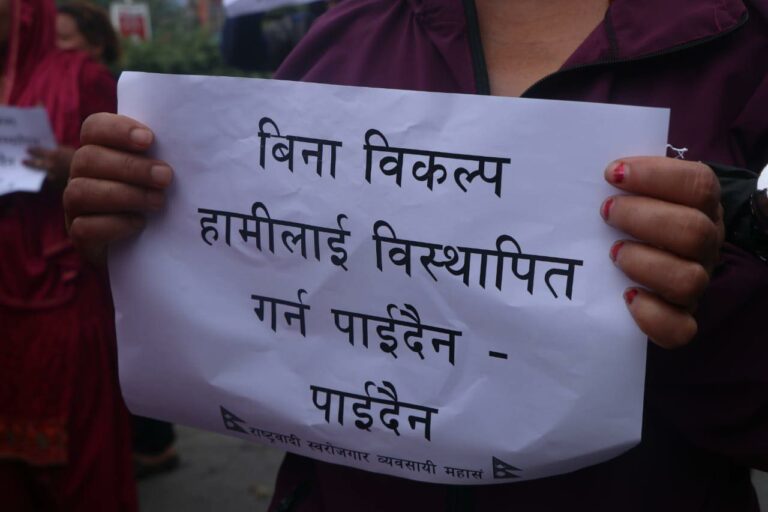 ‘फुटपाथको उचित व्यवस्थापन गर, महानगर प्रहरीको अन्याय अत्याचार बन्द गर, लुटिएको सामान फिर्ता गर, श्रम गर्नेहरुको सम्मान गर, सडकको आवाजको हेक्का राख, मौलिक अधिकार कार्वान्वयन गर, श्रमजीवी वर्ग जिन्दावाद, बिनाविकल्प हामीलाई धोका दिन पाइँदैन, रोजगारीको ग्यारेन्टी गर, सडकमा काम गर्ने हाम्रो रहर होइन बाध्यता हो, संविधानमा लेखिएको मौलिक हकको कार्यान्वयन गर, फुटपाथको उचित व्यवस्थापन गर, महानगर प्रहरीको अन्याय अत्याचार बन्द गर’ जस्ता नारा र प्लेकार्डसहित उनीहरु प्रदर्शनमा उत्रिएका हुन् ।