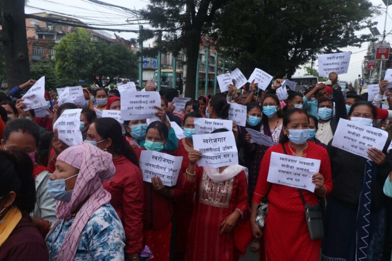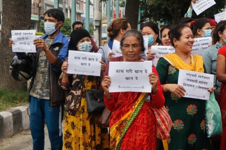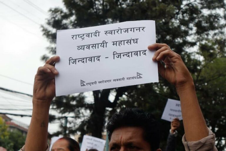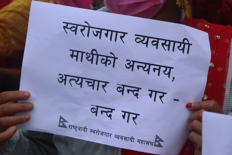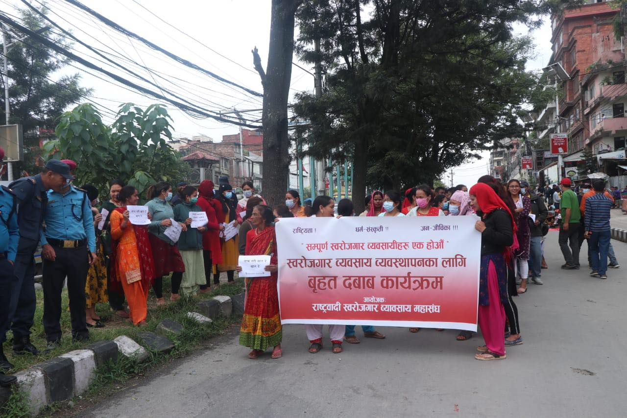 काठमाडौं । काठमाडौंमा फुटपाथमा व्यापार गर्न पाउनुपर्ने माग गर्दै प्रदर्शन भएको छ । राष्ट्रिय स्वरोजगार व्यवसायीको अगुवाइमा फुटपाथ व्यापारीहरुले शुक्रबार प्रदर्शन गरेका हुन् ।
