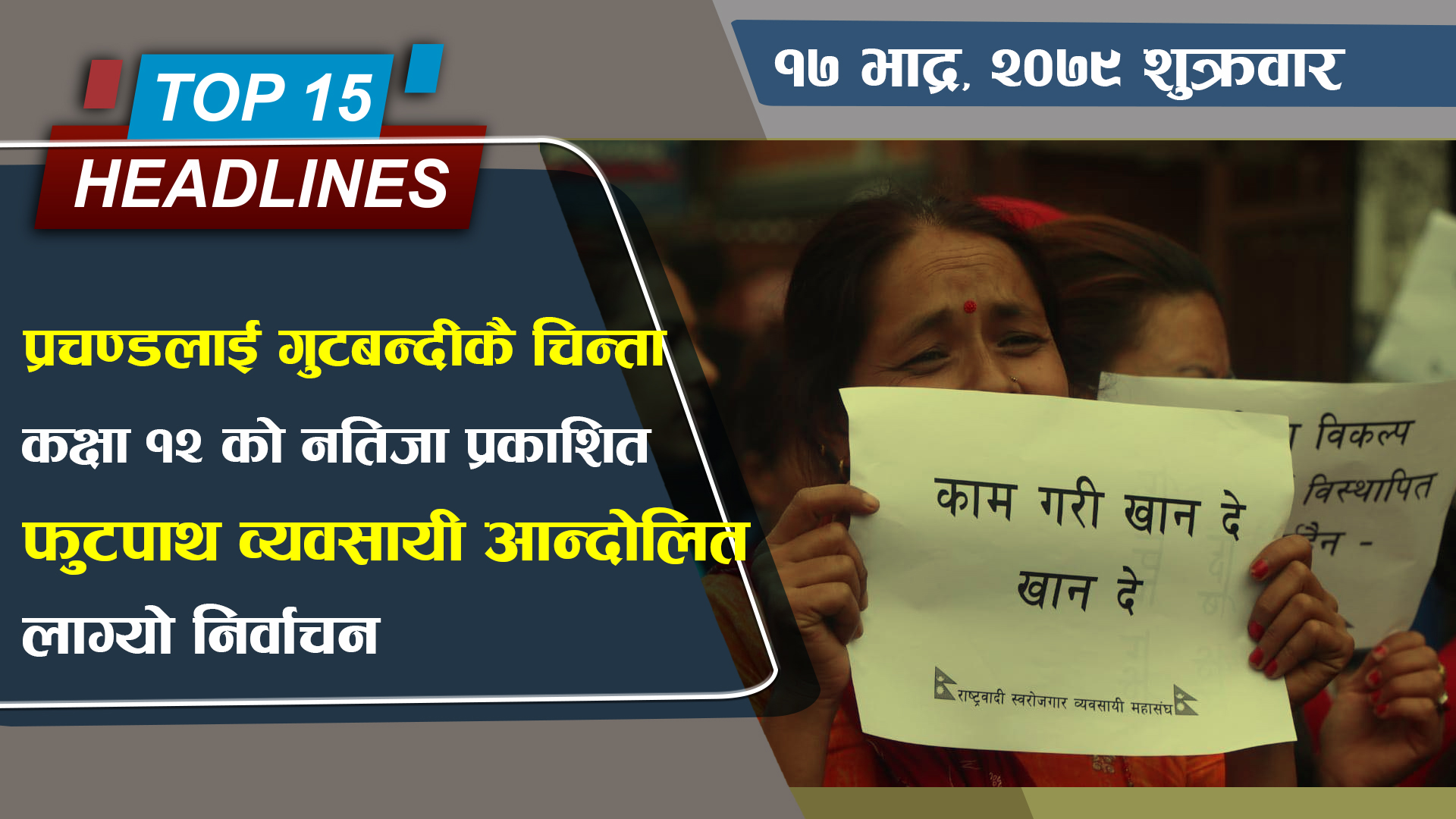 ८. काठमाडौं महानगरले फुटपाथलाई व्यवस्थित बनाउन पसल हटाएसँगै विरोधमा उत्रिए व्यवसायी, फुटपाथमा व्यापार गर्न पाउनुपर्ने मागसहित प्रदर्शन ।