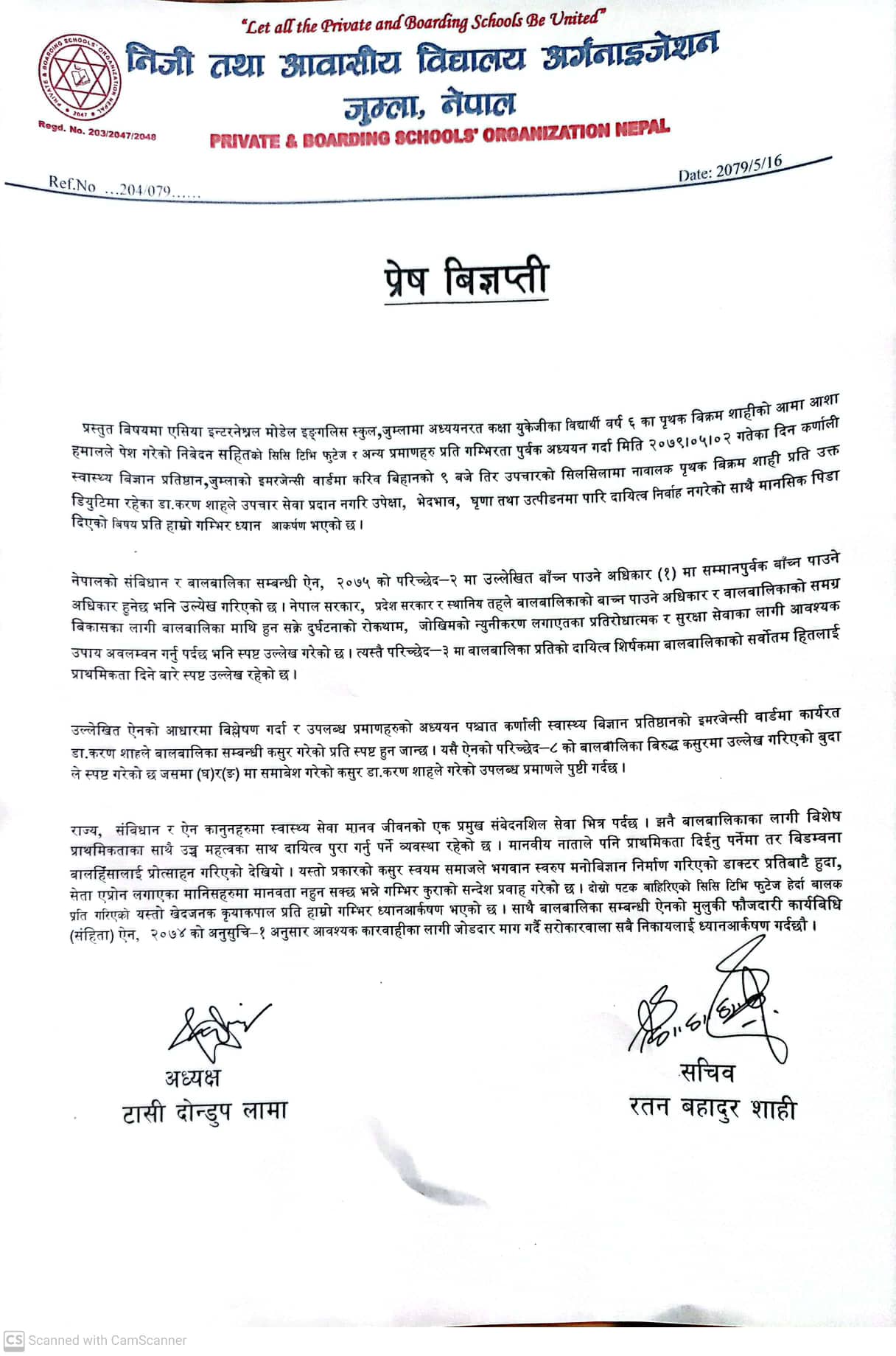 कर्णाली स्वास्थ्य विज्ञान प्रतिष्ठान शिक्षण अस्पताल जुम्लामा कार्यरत चिकित्सक करण शाहले चन्दननाथ नगरपालिका–२ भण्डारीवाडाका ६ वर्षीय बालक पृथकविक्रम शाहीलाई उपचार नगरी बाल अधिकार उल्लघंन गरेको निजी विद्यालयको छाता संगठन प्याप्सनले आरोप लगाएको छ ।