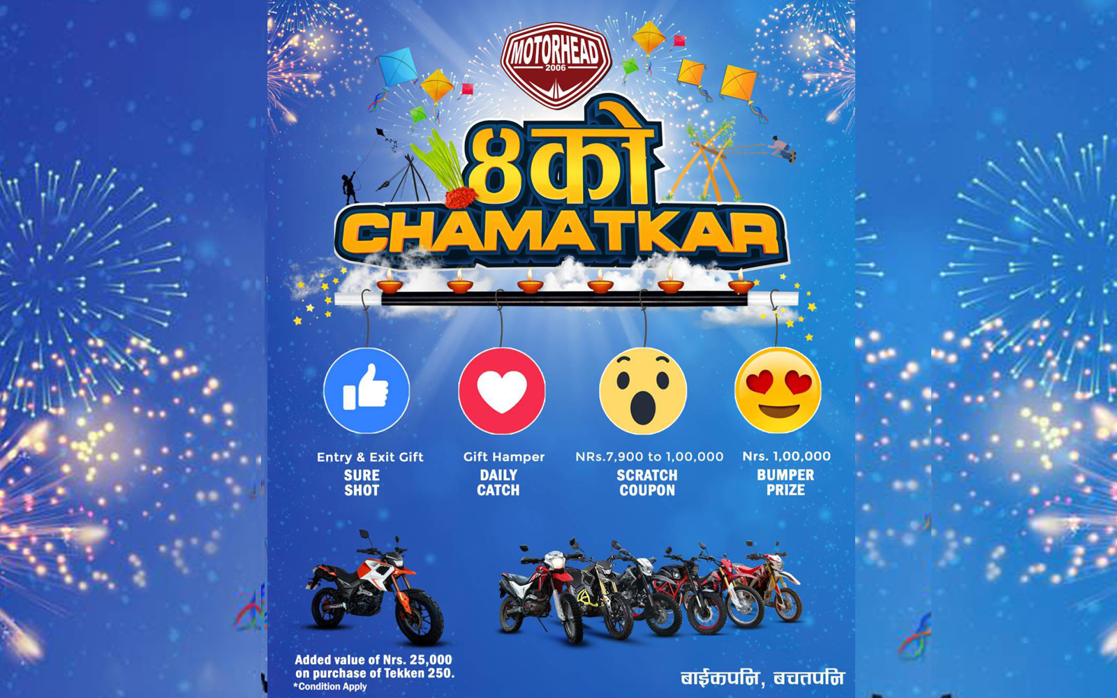 नेपालका लागी मोटरहेड ब्राण्डका आधिकारीक वितरक एस.एल.आर टेक्नो एण्ड ट्रेड प्रा.लि.ले यही १९ भाद्र २०७९ बाट १५ कार्तिक २०७९ सम्म लागू हुने गरी आफ्नो “४ को चमत्कार, वाइक पनि वचत पनि अफर सार्वजनिक गरेको छ । कम्पनीले मोटरहेड व्राण्डका वाइक खरीद गर्ने ग्राहकहरुलाई स्क्रयाच कार्ड मार्फत रु.७,९००।– देखि रु.१,००,०००।– जित्न सकिने अफरको साथै वम्परमा १ जना भाग्यशाली विजेताले रु.१,००,०००।– जित्न सक्ने अफर सार्वजनिक गरेको छ । यसका साथसाथै Tekken 250 पुरानो मोडल जुनै पनि माध्यमबाट खरीद गर्दा सिधै रु.२५,०००।– छुटको व्यवस्था गरेको छ । यसका साथै कम्पनीले हात खाली नहुने उद्देश्यले हरेक शोरुममा पाल्नु हुने ग्राहकहरुलाई टेष्ट राइड गराई उपहार दिने र आफ्नो Pose & Post Campaign अन्तर्गत शोरुममा फोटो खिची Like तथा Share गरी हरेक हप्ता एक जनाले आर्कषक उपहार समेत पाउने व्यवस्था गरेको छ ।