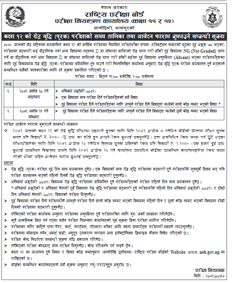 कार्यालयका अनुसार २०७९ सालको जेठ महिनामा सञ्चालित कक्षा १२ को वार्षिक परीक्षामा निममित परीक्षार्थीको रुपमा परीक्षामा सहभागी भइ सैद्धान्तिकतर्फ अन्य विषयमा न्यूनतम डी वा सोभन्दा माथिको ग्रेड प्राप्त गरी बाँकी दुई विषमा एनजी प्राप्त गर्न वा सैद्धान्तिक तर्फ अन्य विषयमा डी वा सोभन्दा माथिल्लो ग्रेड प्राप्त गरी बाँकी बढीमा दुई विषयमा अनुपस्थित भएका परीक्षार्थीहरुका लागि दुई विषयसम्म ग्रेड वृद्धि परिक्षामा सहभाी हनु पाउन गरी परीक्षा सञ्चालन हुन लागेको हो ।