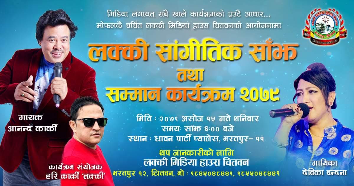 चितवन। मोफसलकै चर्चित लक्की मिडिया हाउस चितवनले १५ असोजमा भरतपुरमा साँगीतिक साँझ आयोजना गर्ने भएको छ । साँगीतिक साँझमा वरिष्ठ गायक आनन्द कार्की तथा गायिका देविका वन्दनालाई सम्मान गर्ने मिडिया हाउसका महाप्रबन्धक हरि कार्की ‘लक्की’ले बताए ।