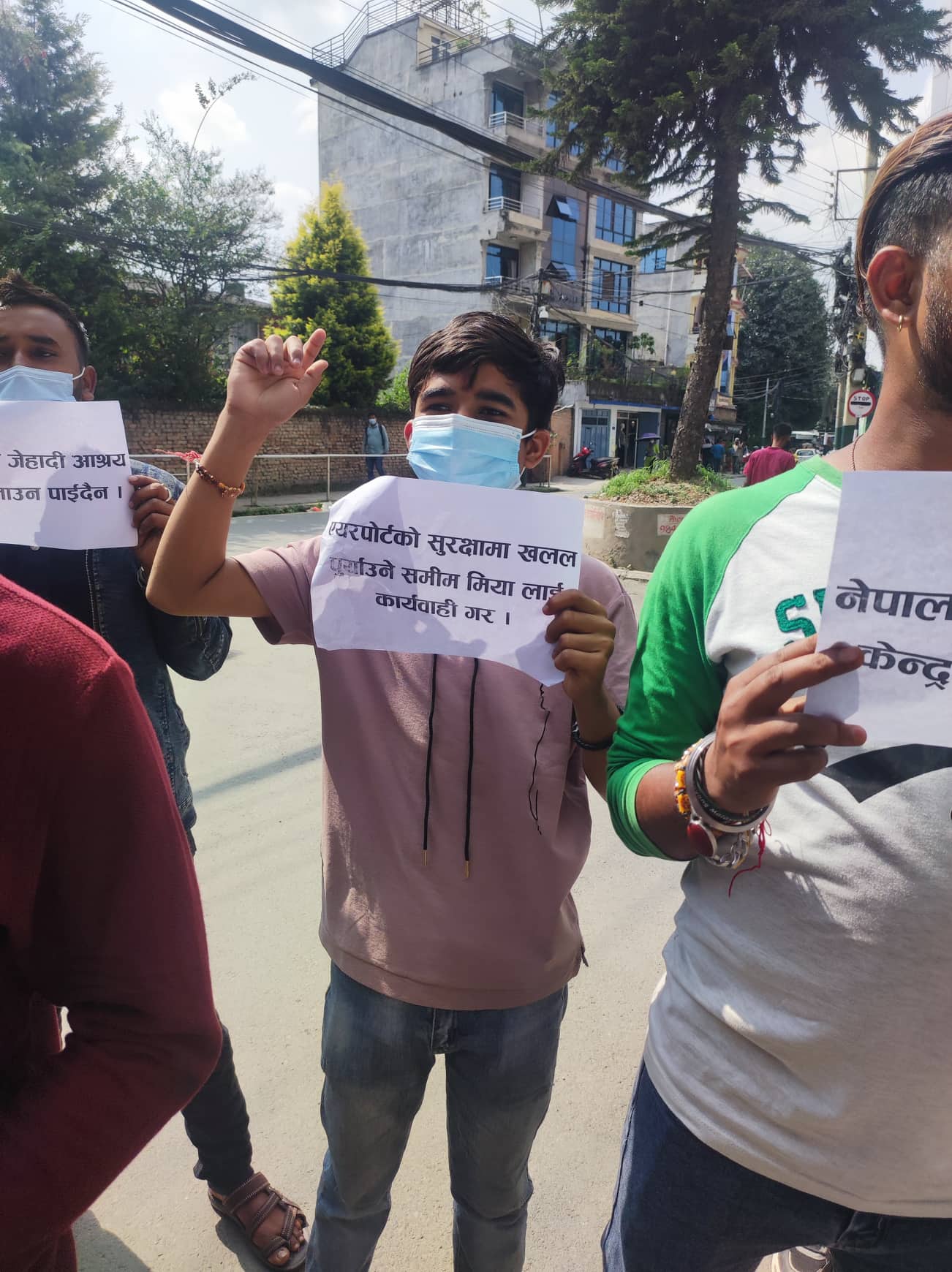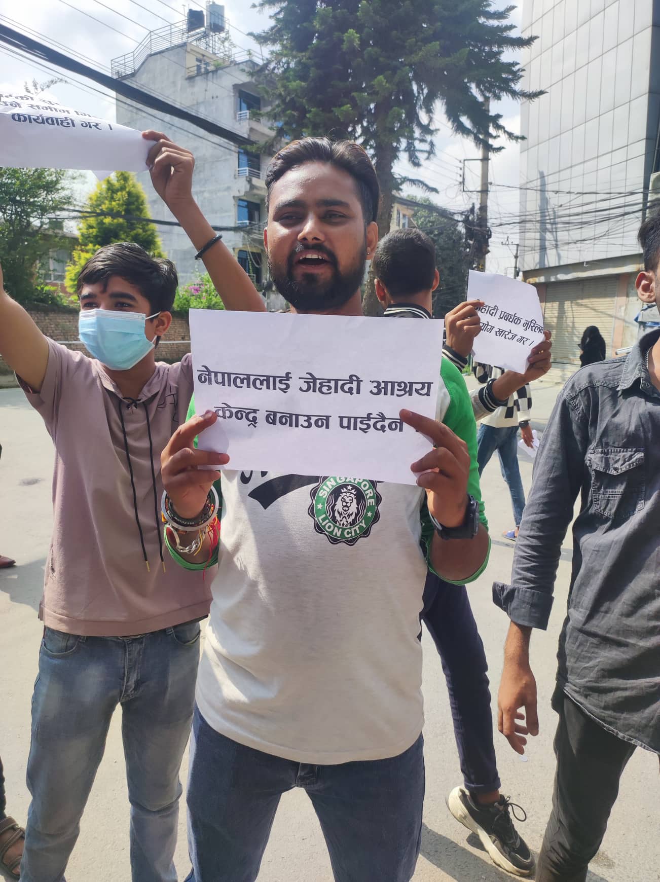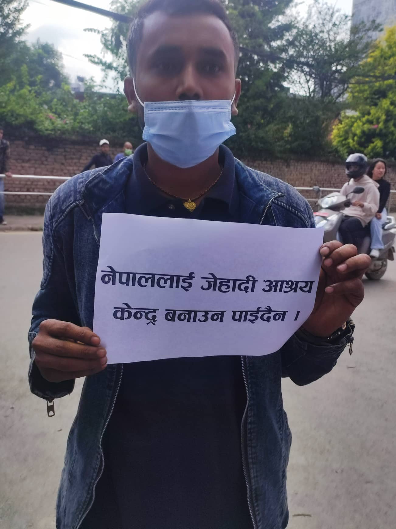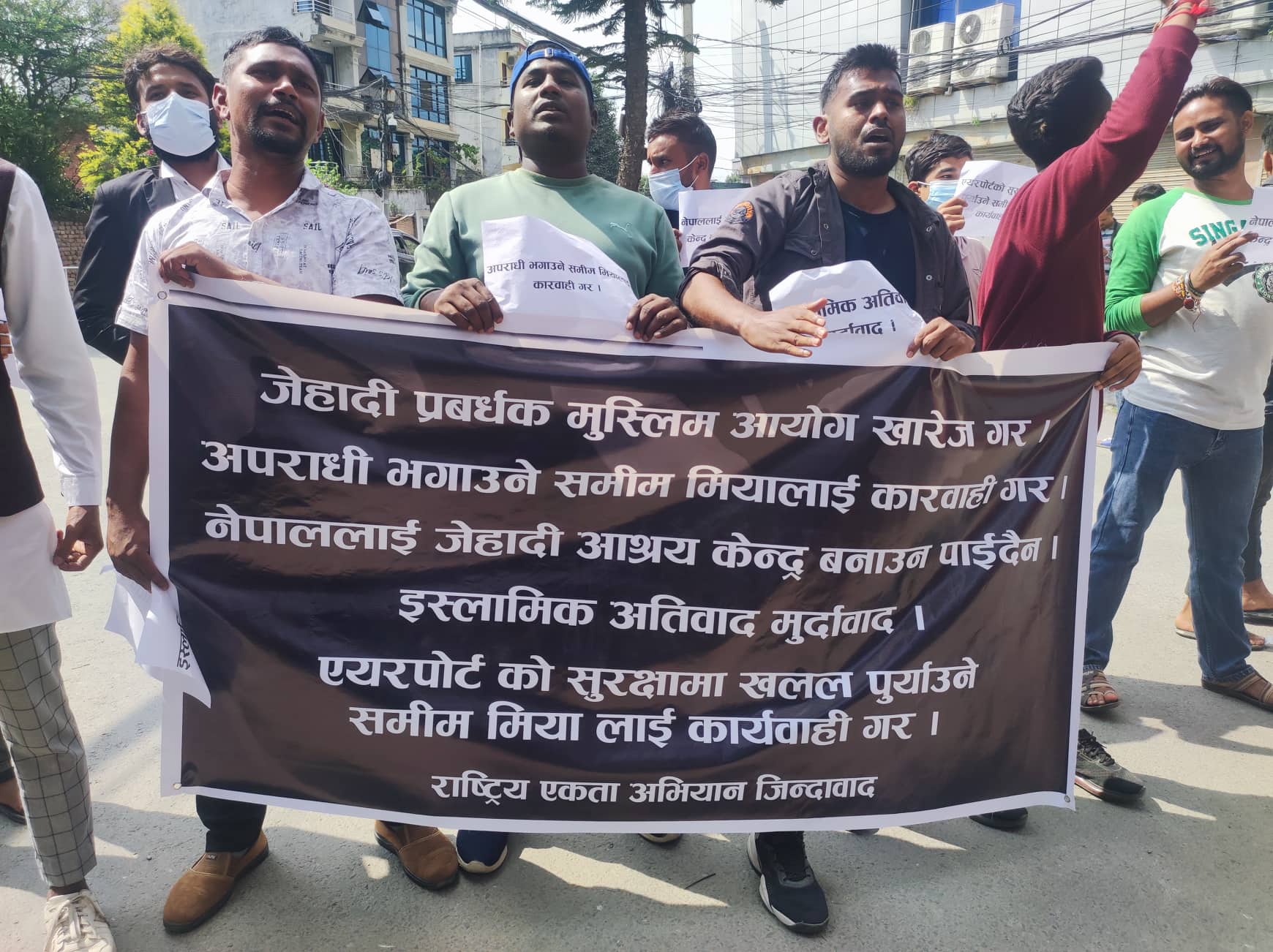 प्रदर्शनकारीहरुले ‘जेहादी प्रर्वर्द्धक ‘मुस्लिम आयोग खारेज गर, अपराधी भगाउने समीम मियाँलाई कारवाही गर, नेपाललाई जेहादी आश्रय केन्द्र बनाउन पाईदैन, इस्लामिक अतिवाद मुर्दावाद, एयरपोर्टको सुरक्षामा खलल पुर्याउने समीम मियालाई कार्यवाही गर’ लगायतका नारा लगाएका थिए।