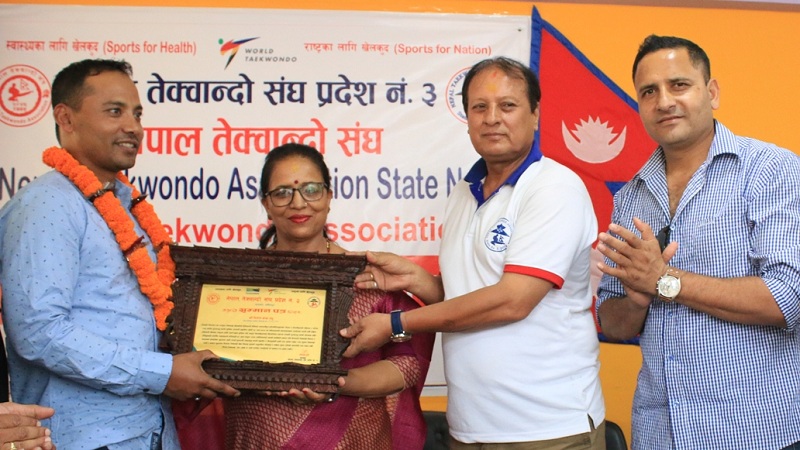 काठमाडौं । पाकिस्तान भएको नवौं दक्षिण एशियाली खेलकुद अन्तर्गत तेक्वान्दोका स्वर्ण पदक विजेता निर्मल श्रेष्ठलाई नेपाल तेक्वान्दो संघ प्रदेश नं.३ ले मंगलबार सम्मान गरेको छ ।