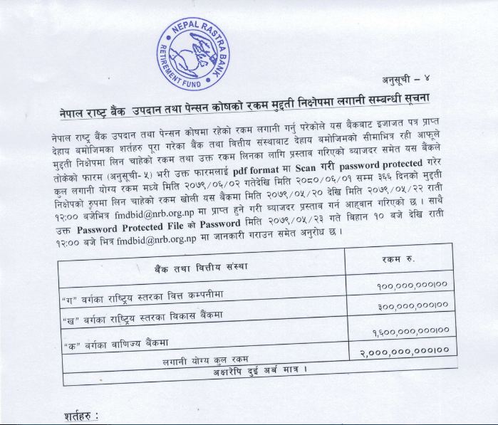 राष्ट्र बैंकका अनुसार पेन्सन तथा उपदान कोषमा रहेको रकम लगानी गर्नको लागि बाणिज्य बैंक, विकास बैंक र फाईनान्ससँग प्रस्ताव आव्हान गरिएको हो । रकम लगानीको अवधि तीन सय ६६ दिन अर्थात् २०७९ असोज दुई गतेदेखि २०८० असोज एक गतेसम्म तोकिएको छ ।