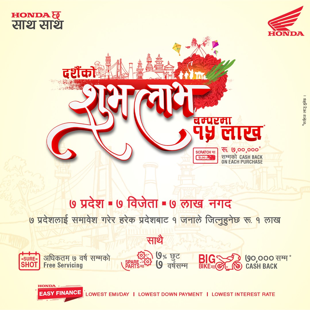 होण्डा टू व्हीलर्सको आधिकारिक विक्रेता स्याकार ट्रेडिङ कम्पनीले “होण्डाको दशैंको शुभ लाभ” नामक आकर्षक ग्राहकमुखी उपहार योजना लिएर आएको छ । यस योजना अन्तर्गत ग्राहकहरूले स्क्र्याच कुपन मार्फत रु ७ लाख सम्मको क्यासब्याक र अन्य आकर्षक उपहारहरु, साथै ७ प्रदेशबाट एक-एक जना गरी ७ जना ग्राहकले रु ७ लाख पाउन सक्नेछन् , बम्परमा लक्की ड्र मार्फत ग्राहकले रु १५ लाख नगद उपहार जित्न सक्नेछन् र साथ-साथै खरीदमा इजी फाइन्यान्सको पनि सुविधा रहेको यो योजना २०७९ भाद्र २० गते देखि सुरु भई सीमित अवधि सम्म मात्रै लागू हुने कम्पनीले जनाएको छ ।
