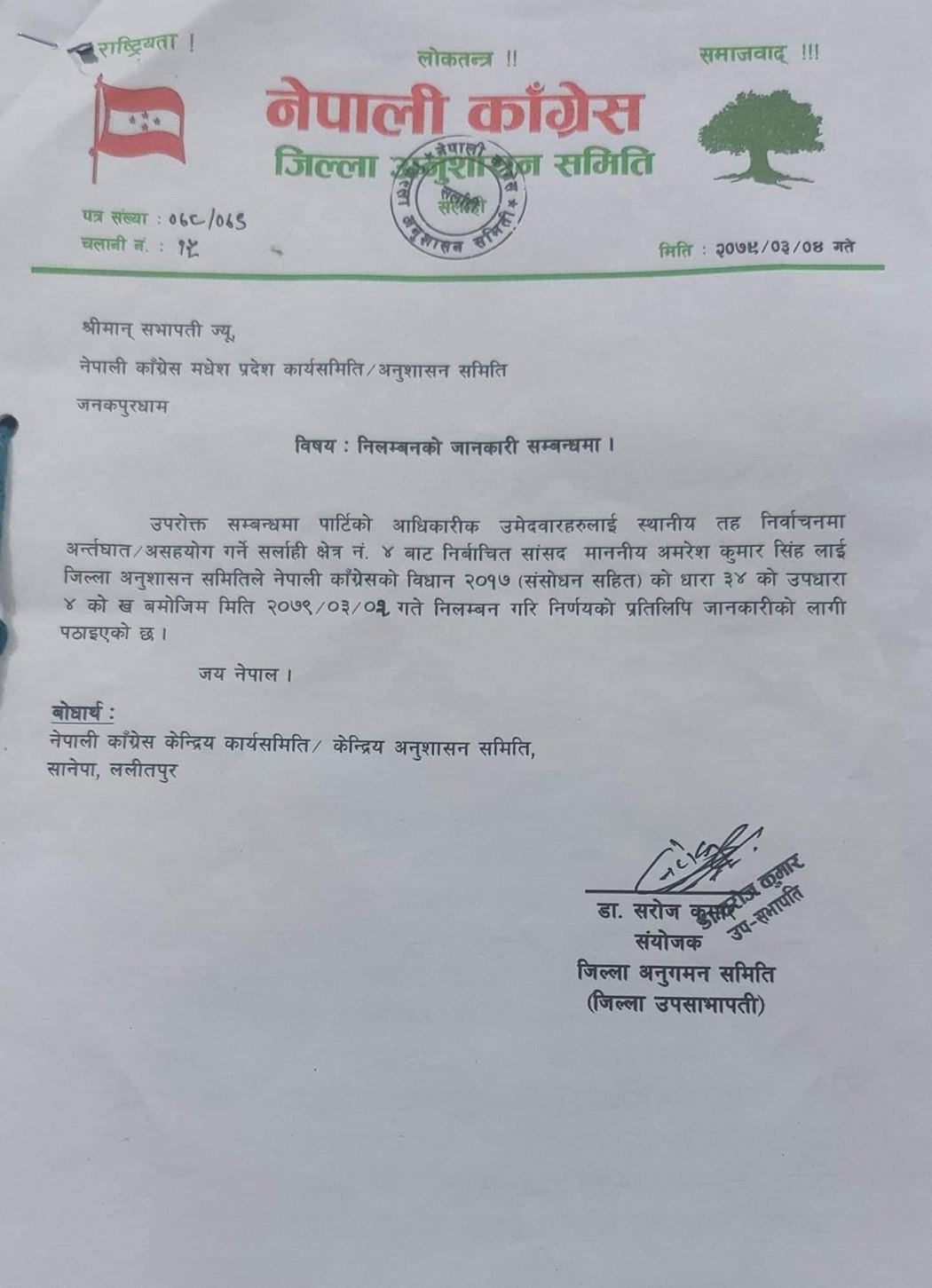 उपरोक्त सम्बन्धमा पार्टिको आधिकारीक उमेदवारहरुलाई स्थानीय तह निर्वाचनमा अन्तर्घात/असहयोग गर्ने सर्लाही क्षेत्र नं.४ बाट निर्वाचित सांसद माननीय अमरेशकुमार सिंहलाई जिल्ला अनुशासन समितिले नेपाली कांग्रेसको विधान २०१७ (संसोधन सहित) को धारा ३४ को उपधारा ४ को ख बमोजिम मिति २०७९/०३/०३ गते निलम्बन गरि निर्णयको प्रतिलिपि जानकारीको लागी पठाइएको छ,’ संयोजक जिल्ला अनुगमन समिति (जिल्ला उपसभापति) डा.सरोेजकुमारले हस्ताक्षर गरेको पत्रमा उल्लेख छ ।