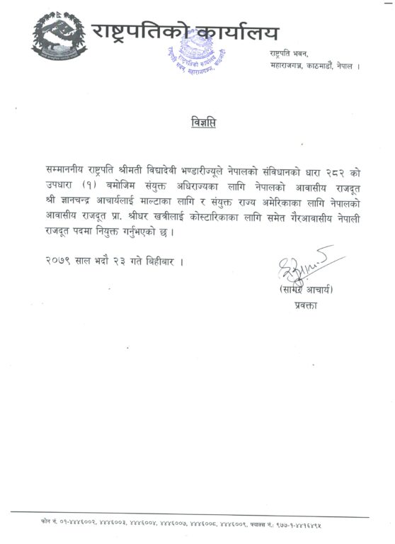 राष्ट्रपति भण्डारीले संयुक्त अधिराज्यका लागि नेपालको आवासीय राजदूत ज्ञानचन्द्र आचार्यलाई माल्टाका लागि र संयुक्त राज्य अमेरिकाका लागि नेपालको आवासीय राजदूत प्रा श्रीधर खत्रीलाई कोस्टारिकाका लागि समेत गैरआवासीय नेपाली राजदूत नियुक्त गरेकी हुन् ।