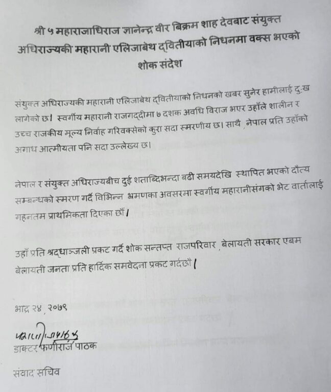 संयुक्त अधिराज्यकी महारानी एलिजाबेथ द्वितीयाको निधनको खबर सुनेर हामीलाई दुःख लागेको छ । स्वर्गीय महारानी राजगद्दीमा ७ दशक अवधि विराज भएर उहाँले शालीन र उच्च राजकीय मूल्य निर्वाह गरिबक्सेको कुरा सदा स्मरणीय छ । साथै नेपालप्रति उहाँको अगाध आत्मीयता पनि सदा उल्लेख्य छ ।