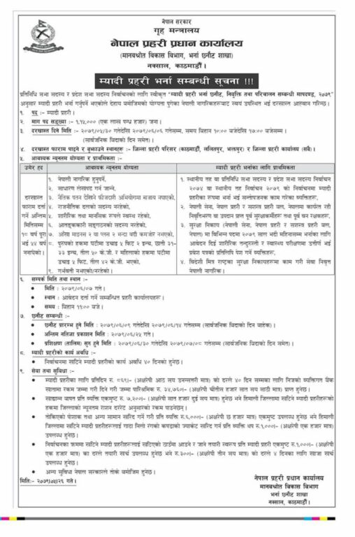 म्यादी प्रहरीका लागि यही ३० भदौदेखि ६ असोजसम्म १८ वर्ष पूरा भई ५४ वर्ष ननाघेका र साधारण लेखपढ गर्न जान्नेहरुले देशभरका प्रहरी कार्यालयमा दरखास्त बुझाउन सकिने प्रहरीले निकालेको सार्वजनिक सूचनामा उल्लेख छ ।