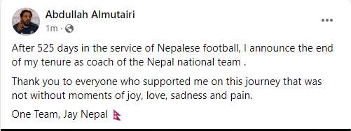 नेपाली राष्ट्रिय टोलीका प्रमुख प्रशिक्षक अल्मुताइरीले दिए राजीनामा